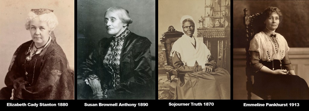 Precisamente en EE.UU. fueron líderes sufragistas entre muchas Elizabeth Cady Stanton y Susan B. Anthony. Destacó la activista afroamericana Sojourner Truth, que vinculó feminismo y abolición de la esclavitud. En Gran Bretaña destacó, entre otras mucha también, la activista Emmeline Pankhurst, fundadora de las Suffragettes.