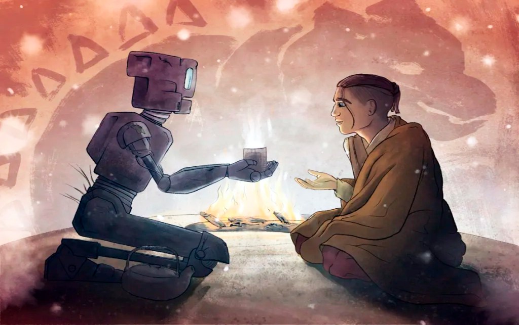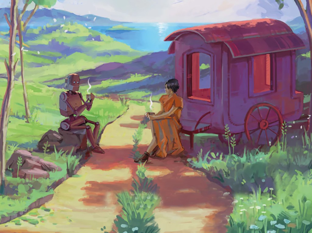 Hasta que un día, un robot llamado Mosscap aparece ante Dex, un monje del té que atraviesa una crisis existencial. Mosscap llega con una pregunta que parece sencilla pero que abre un abismo: “¿Qué necesitan los humanos?”